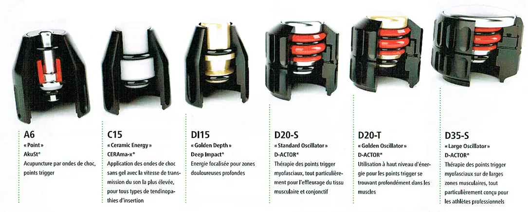 La pièce à main (transmetteur) est un générateur d’ondes de choc balistique actionné par air comprimé. Un projectile (masselotte) est accéléré par l’air comprimé. Le mouvement de celui-ci, combiné à son poids permet d’accumuler de l’énergie cinétique qui lorsque le projectile frappe le l’applicateur d’impulsions, transforme cette énergie cinétique en énergie potentielle ou acoustique. Les impulsions sont alors transmises dans les tissus à traiter.