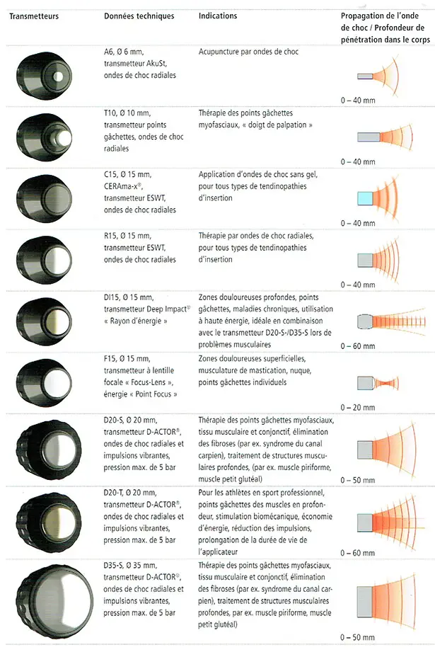 La profondeur de pénétration des ondes de choc radiales est fonction du type d'applicateur utilisé et de la pression sélectionnée.